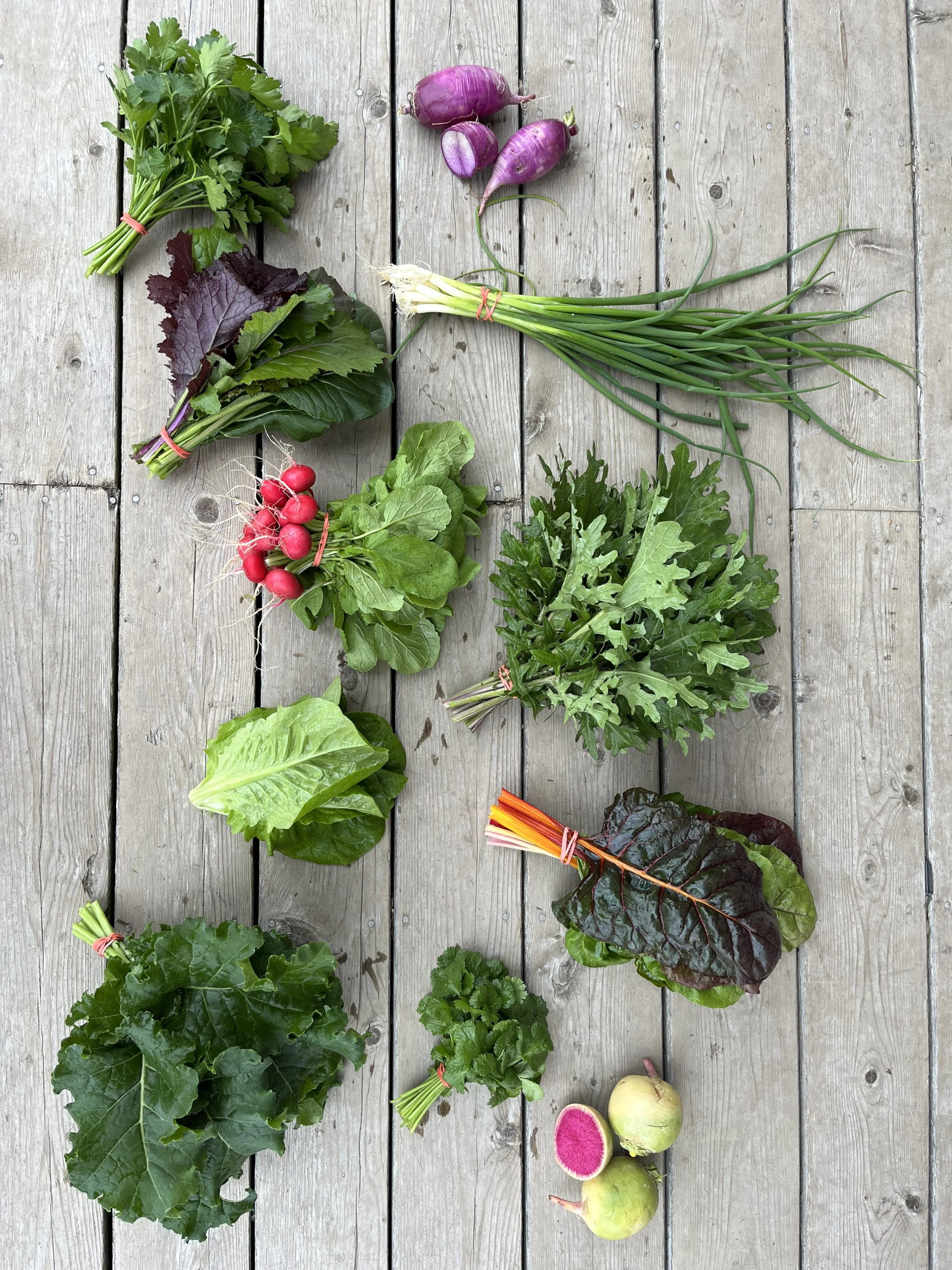 Each week we will harvest 7-9 of the best crops available in the fields. We’ll include a diverse selection including salad greens and cooking greens, roots, brassicas, alliums, herbs and seasonal fruiting vegetables (tomatoes! cucumbers!). Small shares just have 5 items.